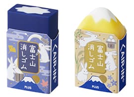 もちつきを楽しむうさぎや月、すすきなどをモチーフにした2柄の消しゴムケースを採用しました。消しゴム本体の樹脂は、月を眺めて過ごす秋の夜をイメージした群青色の「夜富士」と、輝く月を思わせる山吹色の「月富士」の2柄(2色)セットです。かわいいながらも、静かな秋の夜の風情を楽しんでいただけます。